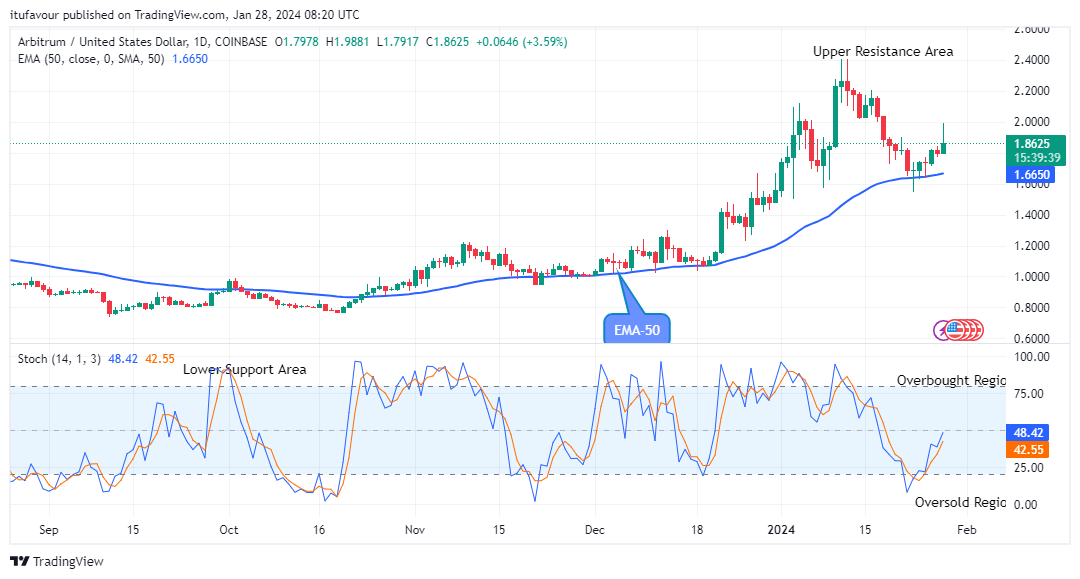 Adding to this, the price of Arbitrum will continue to make a buy-trade setup as shown by the daily stochastic which is pointing upwards. Hence, if the coin buyers manage to break above the $2.406 supply trend line, the market participants may witness a new rising pattern and this may reach a high at the $2.600 mark soon in its medium-term time frame.