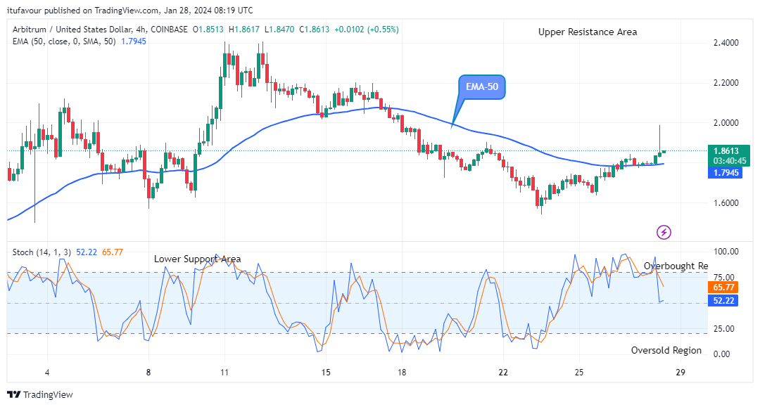 Analyzing the chart below, we can see clearly that ARBUSD’s price makes a buy-trade setup in its medium-term outlook. The price currently trades above the EMA-50 which confirms its bullishness.