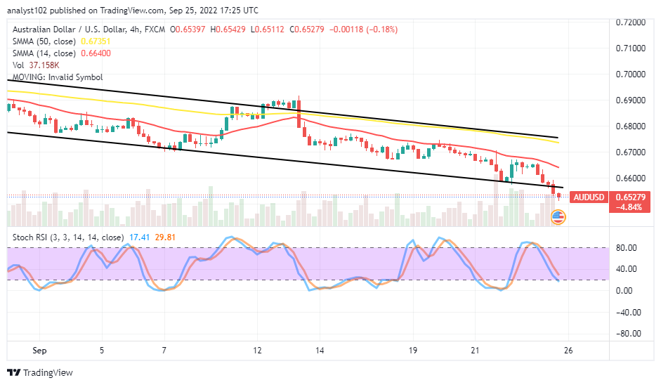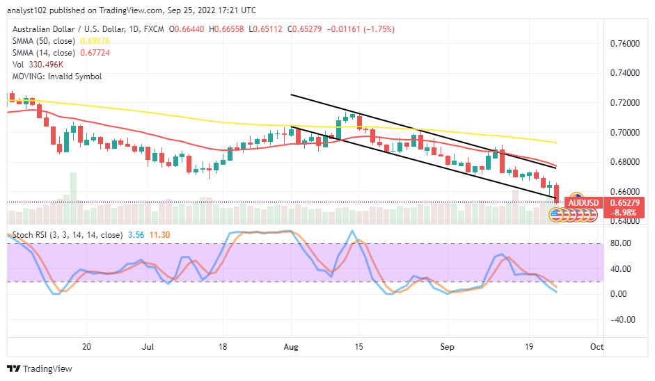 The AUD/USD medium-term chart reveals the currency pair market draws southward toward the 0.6500 support level below the lower bearish trend line. The 14-day SMA indicator is at 0.66400 underneath the 0.67351 value line of the 50-day SMA indicator. The Stochastic Oscillators have crossed southbound from around the 80 range to the positions of 29.81 and 17.41 range values, denoting the gravitational forces to the south direction have gradually been exhausted. Therefore, sellers need to be cautious of exerting further orders at this point.