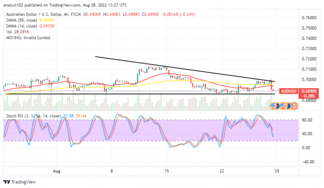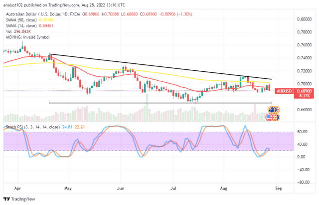 The AUD/USD daily chart depicts that the currency pair trade operation holds below the 0.7000 resistance, following a touch of it while trying to swing upward from a lower value line around 0.6800 level in recent time. The 14-day SMA indicator is at 0.6946, underneath the 0.7019 value line of the 50-day SMA indicator. The Stochastic oscillators have crossed northbound from the oversold region to place at 22.21 and 24.81 range values. They are attempting to close their lines southward.