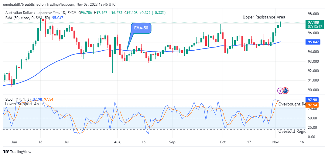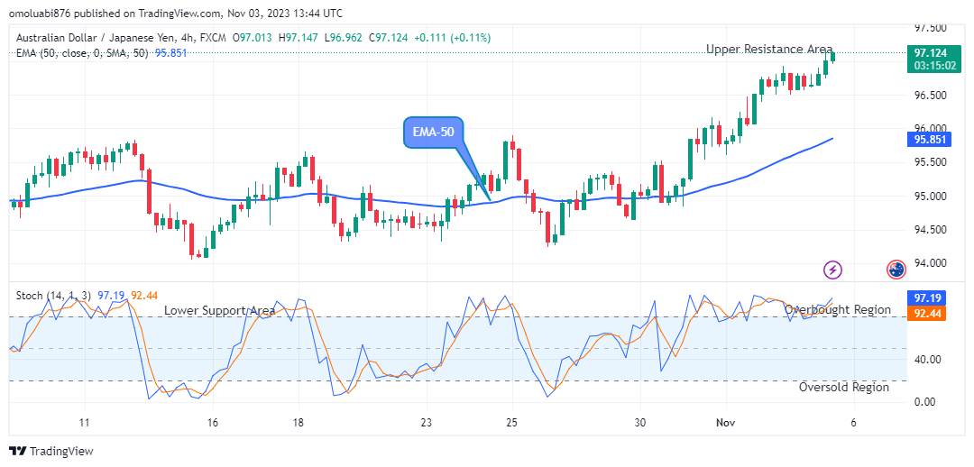 Earlier today, the bull run caused a rise in the price of AUDJPY to a high at the $97.14 level above the moving averages. This current trend will enable the price to remain on the upside and rise or break out to the upside. This however creates a strong area of interest for buyers.