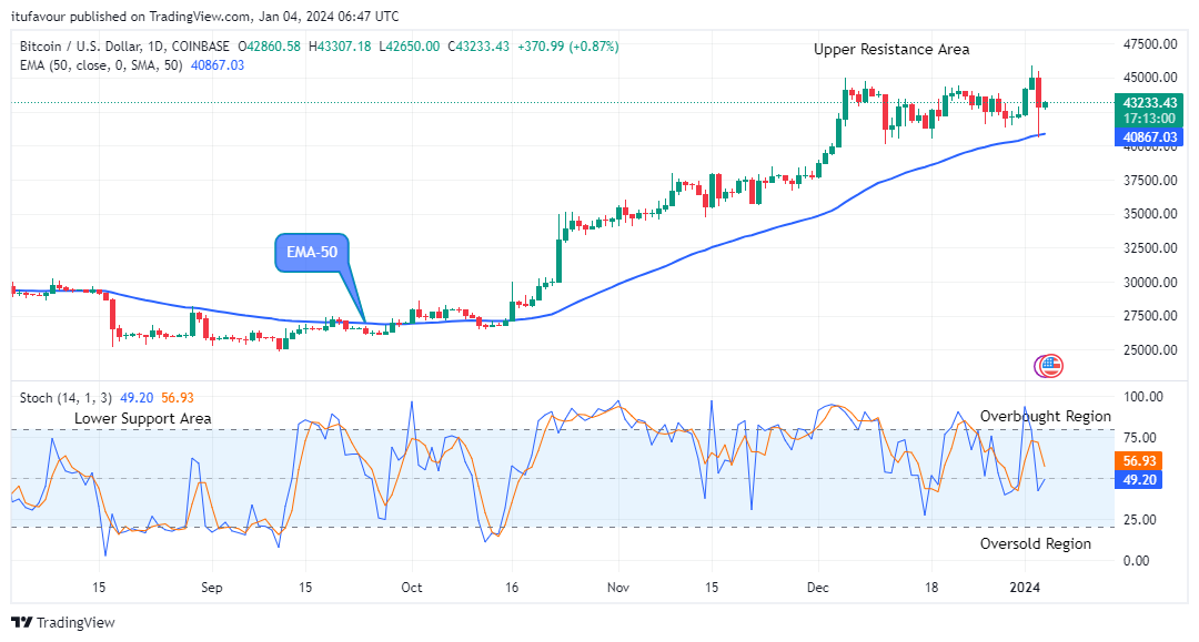 On the daily chart, the BTCUSD price is currently facing overhead resistance and trading at the $43307.18 correction level. Furthermore, rising prices provided more evidence for a bullish recovery.