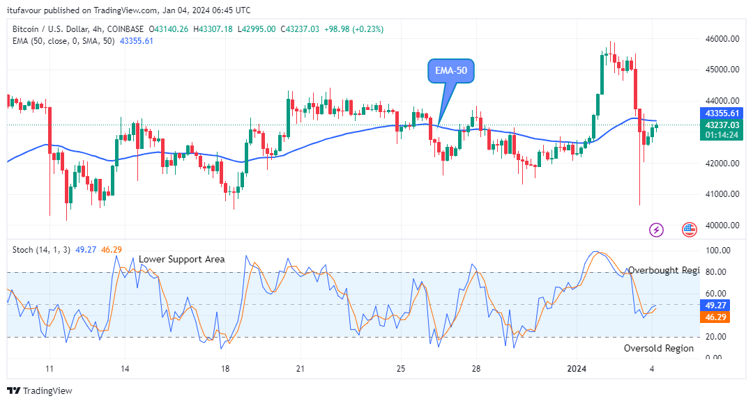As the 4-hour session begins today, the market price of BTCUSD rises to a $43307.18 high level below the moving averages, indicating the return of the bulls to the market and improved bullish market sentiment.