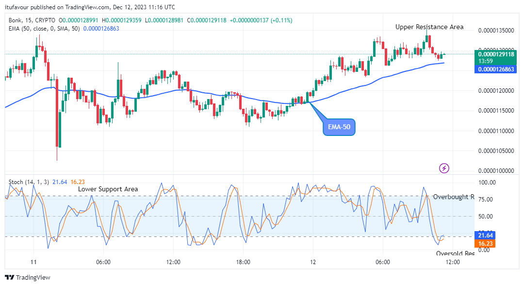 The market price of BONKUSD has just broken up the EMA-50 at the $0.0000129 supply level as the 15-minute chart opens today. This will give the crypto a high tendency to further rally up.