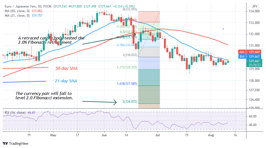 EUR/JPY Long-Term Analysis: BearishThe currency pair is in a downward move. Since July 19, the EUR/JPY pair fell to level 129.00 low and resumed consolidation above it. The selling pressure will resume if price breaks below the current support. The pair is fluctuating above the current support but …