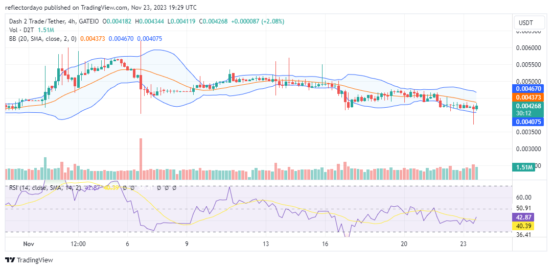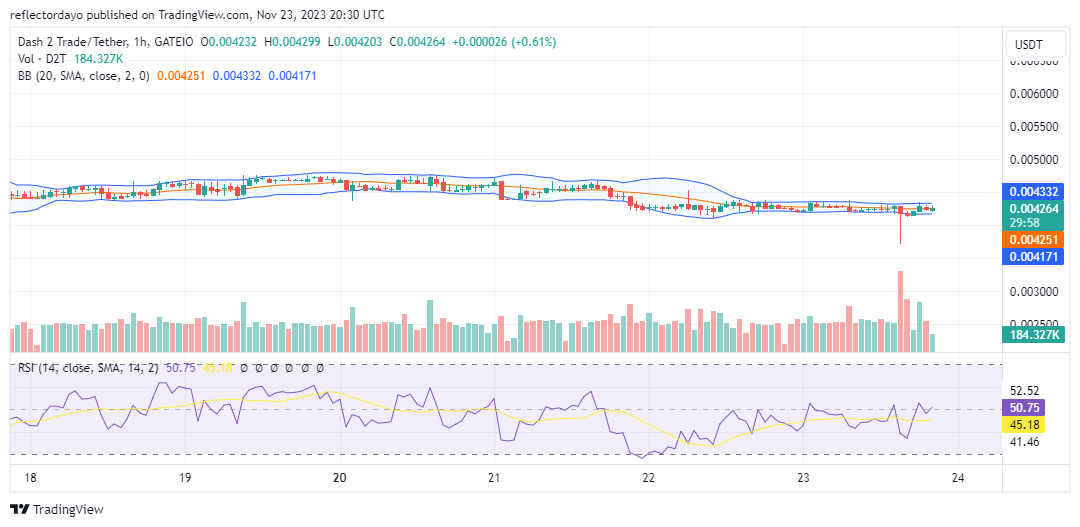 The $0.0042 price level has emerged as a pivotal support, instrumental in driving the market to a peak of $0.0062 on November 6. Subsequently, bearish pressure has retraced the D2T/USD market to this crucial support, resulting in a lateral consolidation at this level. A recent development marked by a hammer candlestick indicates a potential revival of bullish momentum, suggesting the likelihood of a forthcoming rally towards the $0.0062 threshold.