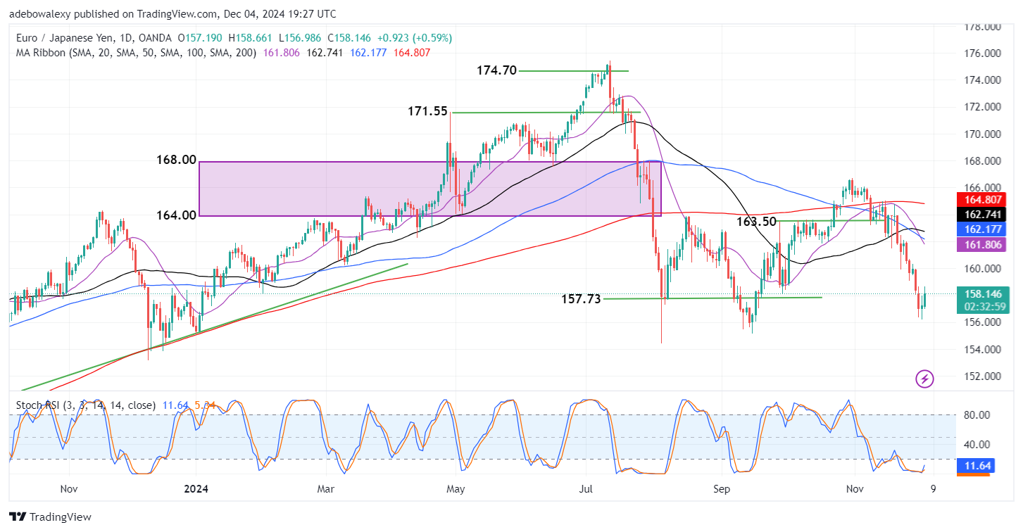While the financial market has been significantly impacted by political turmoil in France and South Korea, slightly better PMIs seem to have assisted the EURJPY pair in recording some bullish retracement. This saw the pair resume trading above the 157.73 level. However, the daily chart still shows price movement below technical landmarks, so let’s see how things may proceed in this market.