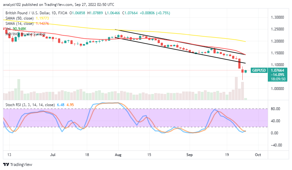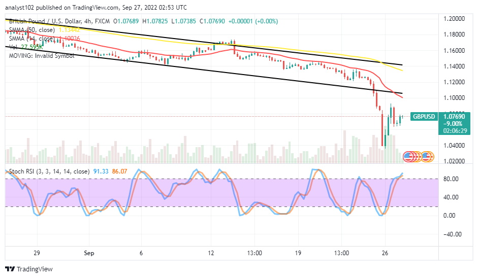 The GBP/USD medium-term chart reveals the pairing currency price drops aggressively to the 1.0400 support level. There have been convergences of candlesticks around the lower-trading zone, causing a rallying mouton to a reasonable extent below the SMAs. The 14-day SMA indicator is at 1.10036, underneath the 1.13442 value point of the 50-day SMA indicator. The Stochastic Oscillators are in the overbought region, maintaining 86.07 and 91.33 range points. Price may push for a touch of resistance around the 1.10000 level before reverting to a declining move afterward.