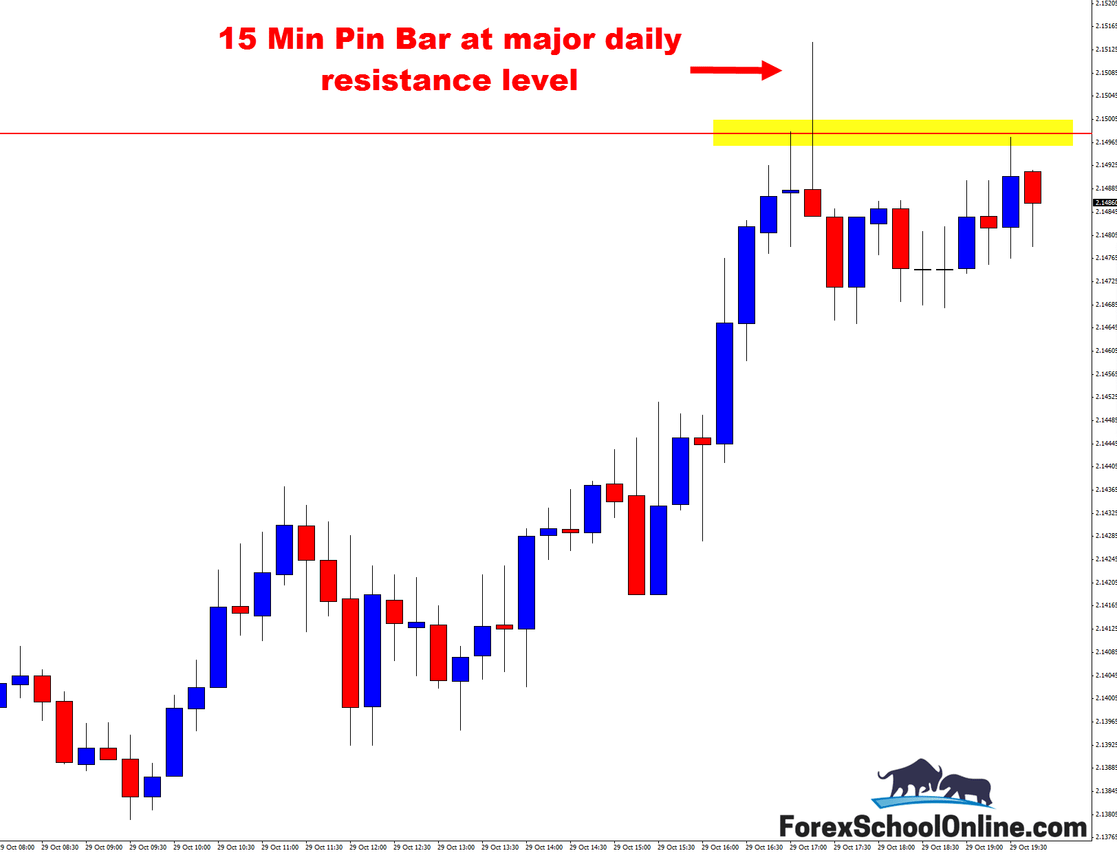As the daily chart shows here, this is a major level on the daily chart. The 15 minute chart is firing off a really solid pin bar, but it is against the strong momentum on the 15 minute chart. As I show you in the How to Trend Trade Price Action Lesson, it is important we trade each chart individually and trade each trend as it’s own.
