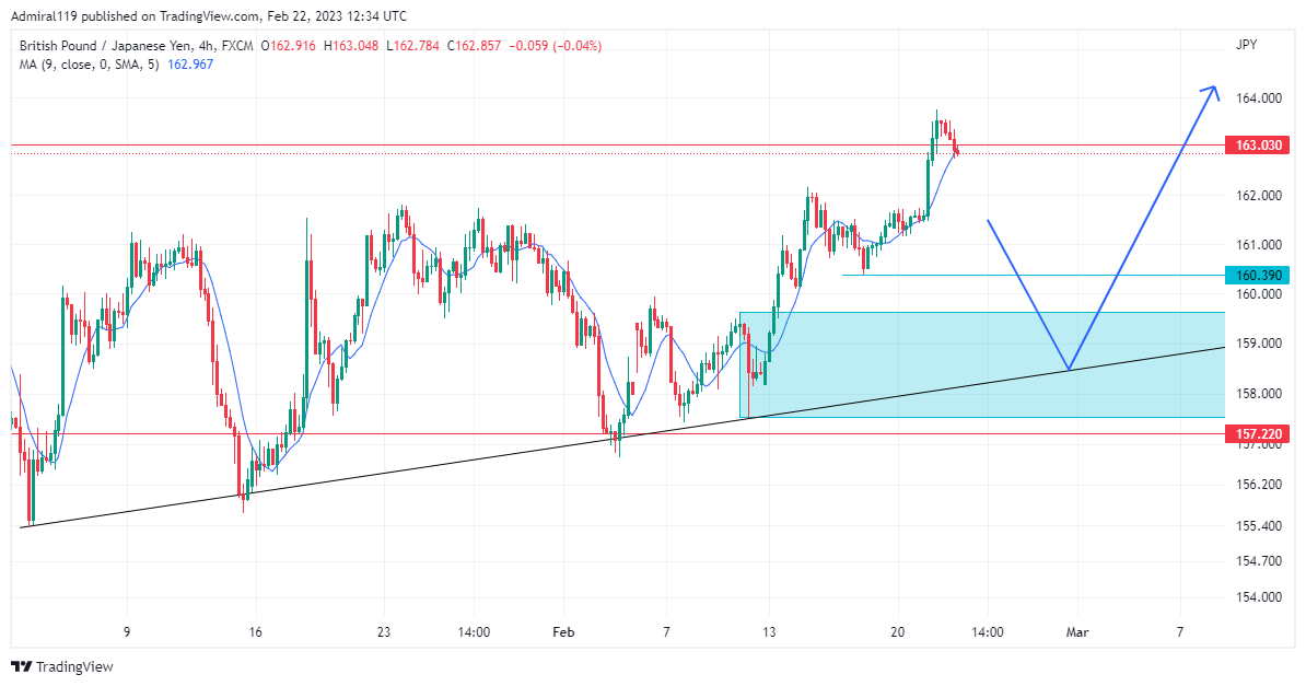 On the daily chart, the market’s environment was in a chokey until the last quarter of the year 2022. This was due to the price’s consistent movement between the major resistance and support levels. However, there has been a slight turnaround as the bulls and bears struggle to dominate the market. Following the rejection of the price at the 172.130 major resistance, the GBPJPY made a massive crash to the downside, flipping the market bearish and breaking the previous support at the 163.030 price level.