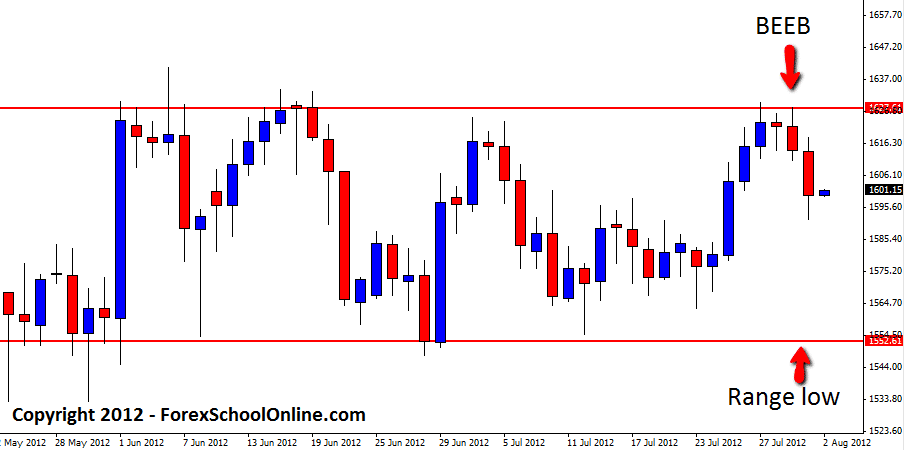From this area we may see price move higher back to test the high of the range. If price continues lower the next major support area is the range low around $1552.