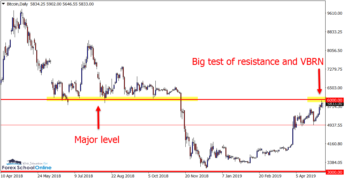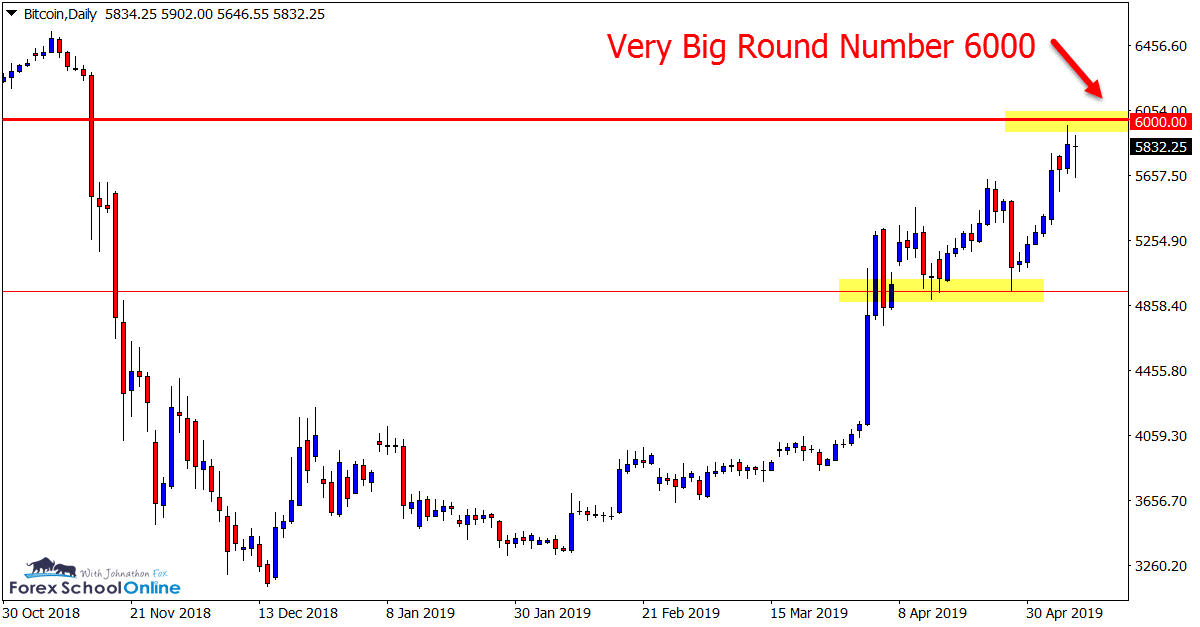 Price action on the daily chart of Bitcoin is creeping higher looking to make a test of the major resistance and Very Big Round Number = VBRN 6000.