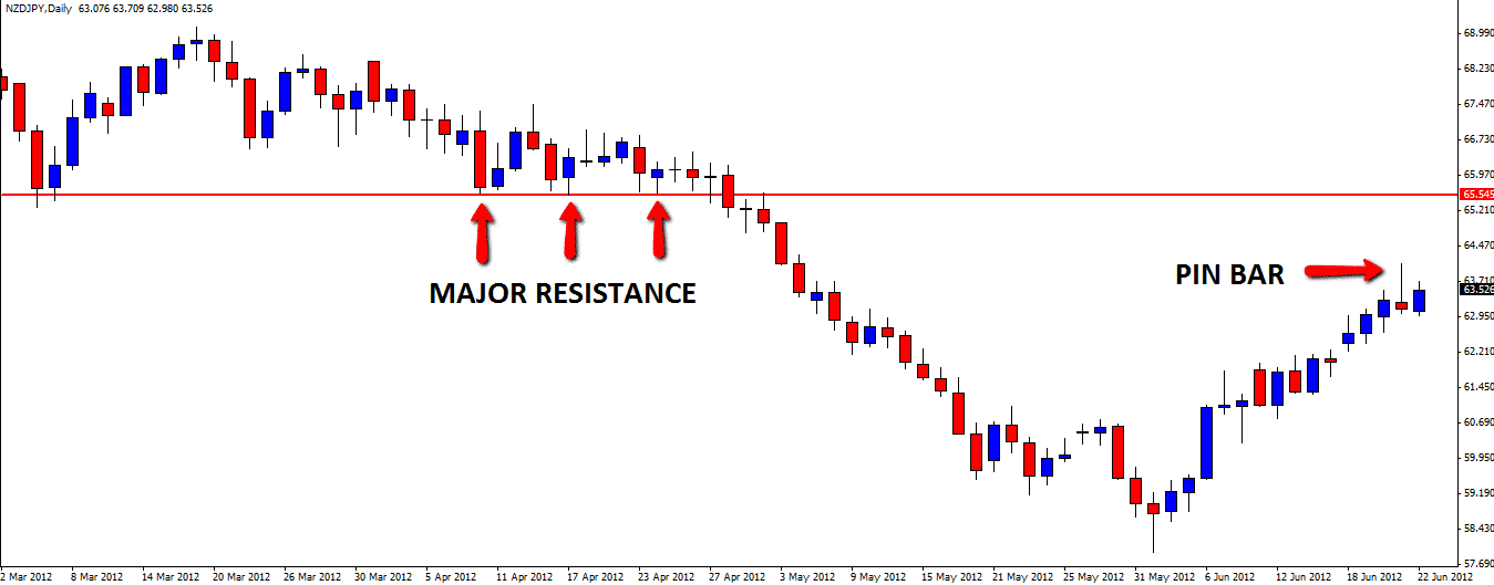 At the close of Thursday New York session the NZDJPY formed a Bearish Pin Bar. This Pin bar was formed from long term resistance, but against the very short term momentum.