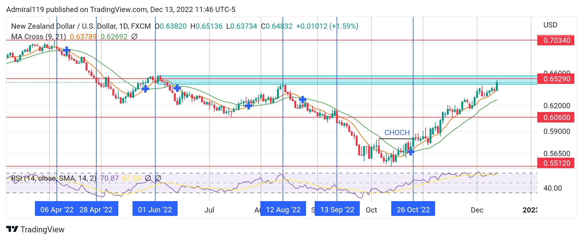 The 0.65290 price level was strong enough to rebuff the price to the downside on June 1, 2022. The market has been in a downtrend on the daily chart since April 5, 2022. Coupled with the price’s reactions at the resistance levels of 0.70340 and 0.64290, NZDUSD keeps maintained a bearish impression until the Change of Character (CHOCH) on October 26, 2022. However, the bearish order block at the 0.65290 supply zone was used to reject the price’s upward movement in August 2022.