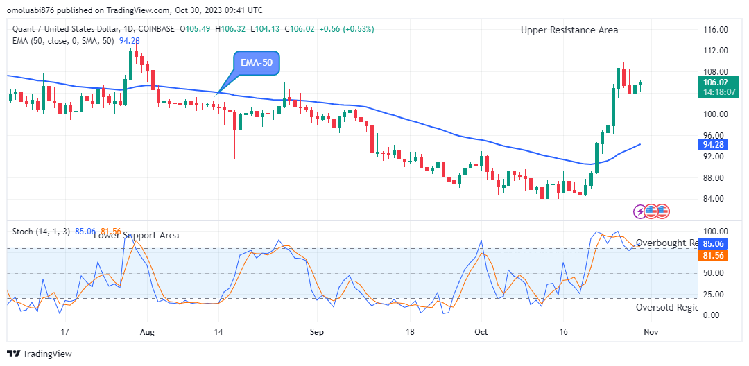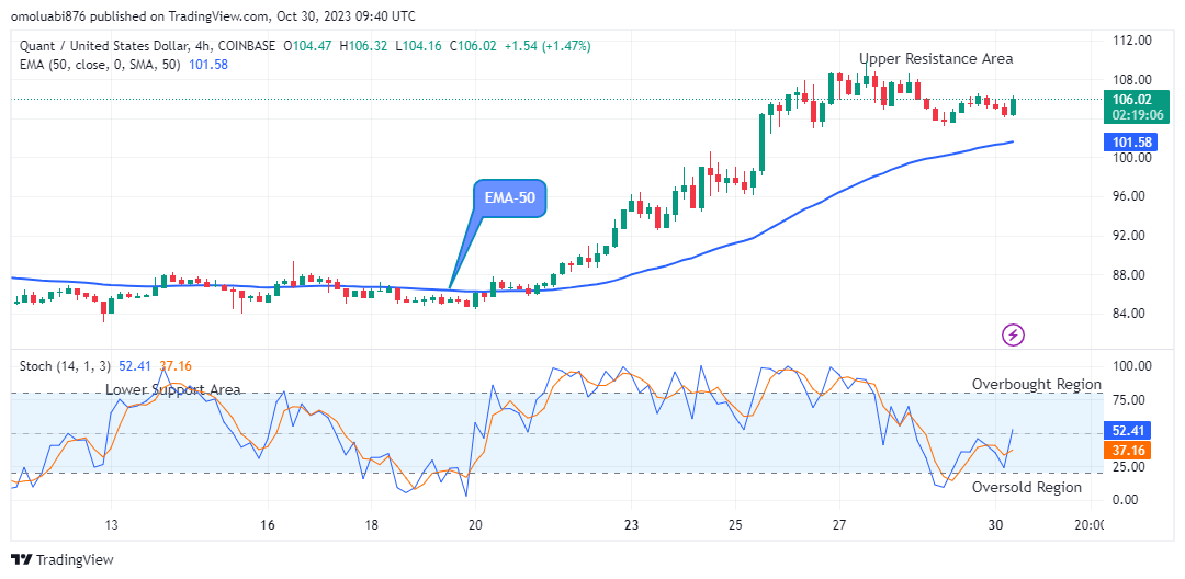 Additionally, the underlying sentiment suggests an uptrend continuation in the coming days as indicated by the daily stochastic. It is expected of buyers to push the price of Quant further up to a significant level and in this case, the target might be the $116.00 upper resistance level as soon as the price is negotiating the upper resistance level in its higher time frame.