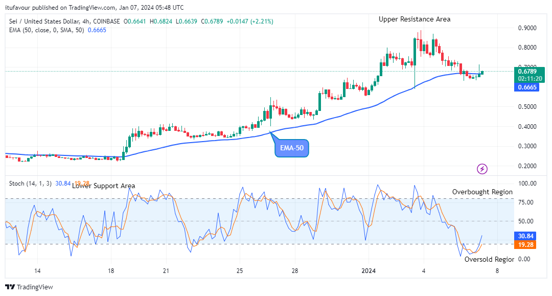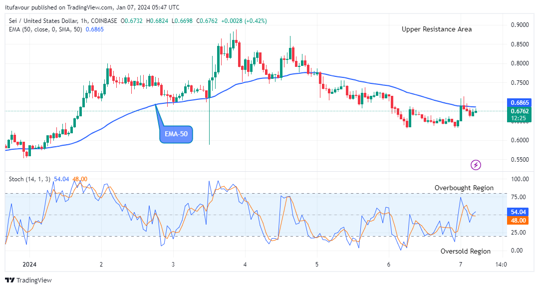 The market price of Sei has just resumed its recovery pattern at the $0.6824 supply level below the EMA-50 as the 1-hourly chart opens today; this affirms the presence of more buyers in the market and the price movement could reach the $0.8829 previous high and increases further.