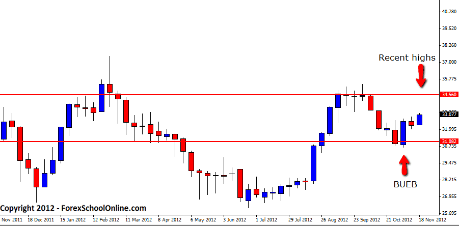 Price during yesterdays session broke the BUEB high and moved higher. Price Action traders who entered this setup would only have been entered once price broke the BUEB highs. If we see price continues it move higher we could see price move up to test the recent highs. See chart: