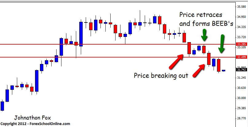 In a previous post we discussed how price on Silver had broken out of a tight range, and a move back higher to the low of this range could have been a chance to get into the new down trend. To read that post see here: Silver Break Out