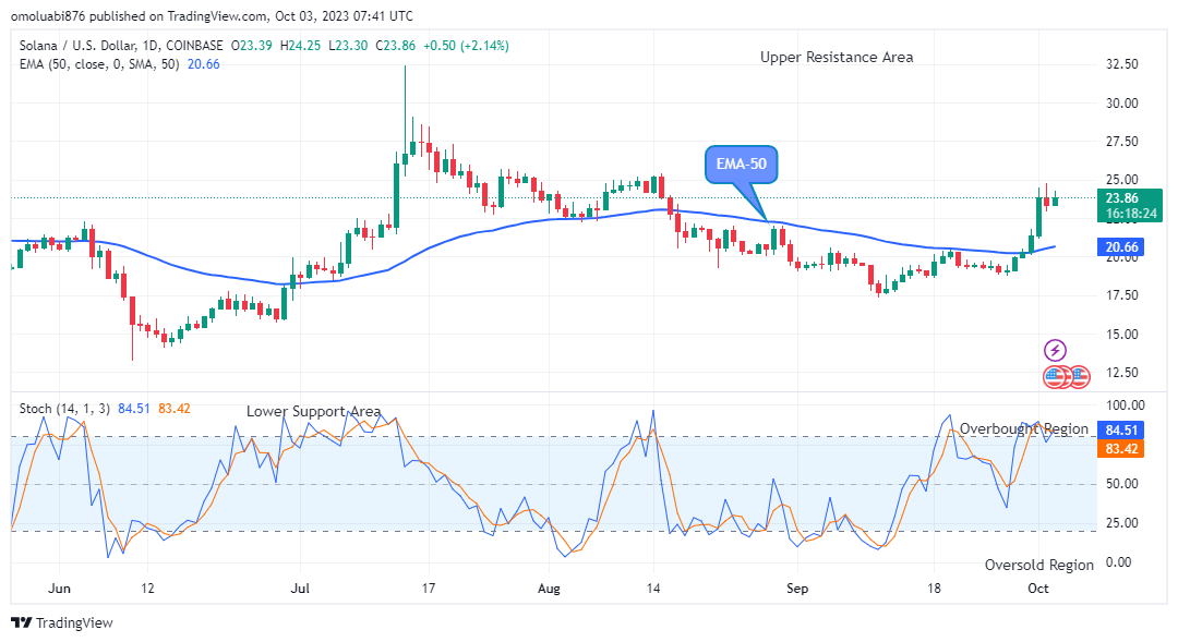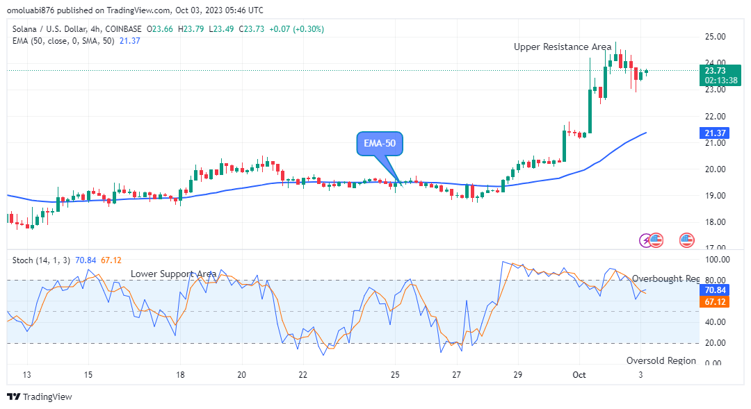 SOLUSD is losing bearish momentum as it rises to a $23.79 high level above the EMA-50 as the 4-hourly chart begins today. This is due to a high bullish impact on the market price.
