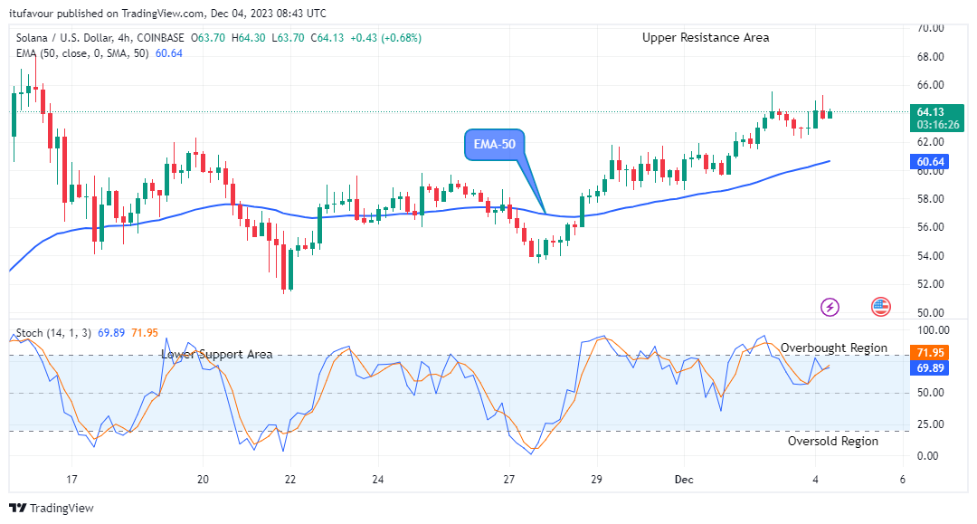 The market price of SOLUSD which increased to a $64.30 high level suggests an improved bullish market sentiment. Thus, closing the 4-hour session above the $67.13 will put the trade more on the buy side.