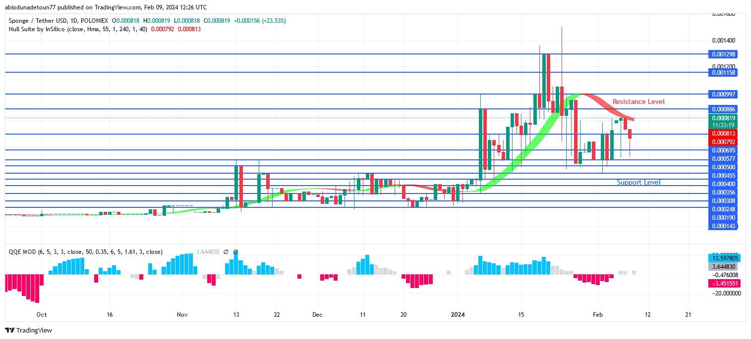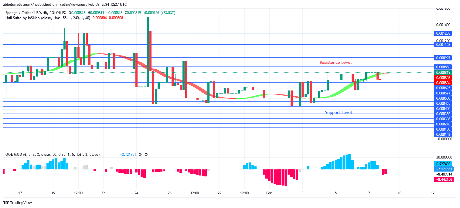The bulls may be able to hold their advantage in the market if Sponge breaks past the $0.000892 barrier level and runs into resistance in the $0.000996 to $0.001158 area. If $0.000697 is not maintained, the price can fall below the $0.000580 and $0.000500 support levels.