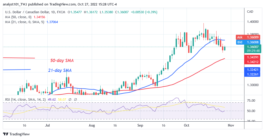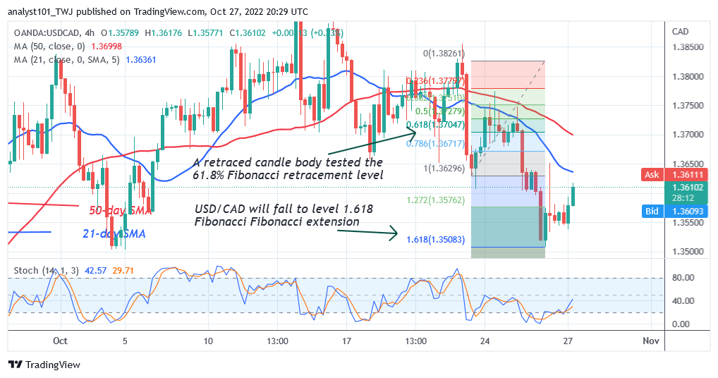 USD/CAD is in a downtrend as buyers recoup above the 1.3508 low. The pair is correcting upward to retest the moving average lines. On October 21 downtrend, the pair corrected upward and a candle body tested the 61.8% Fibonacci retracement level. The correction implies that USD/CAD will fall to level 1.618 Fibonacci Fibonacci extension or level 1.3508.