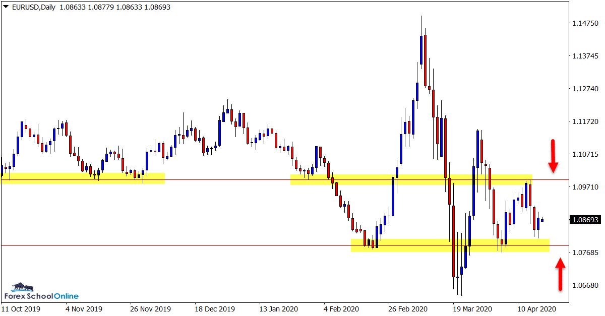 Price on the daily chart is stuck between a daily support and resistance level that both could provide potential trade setups.