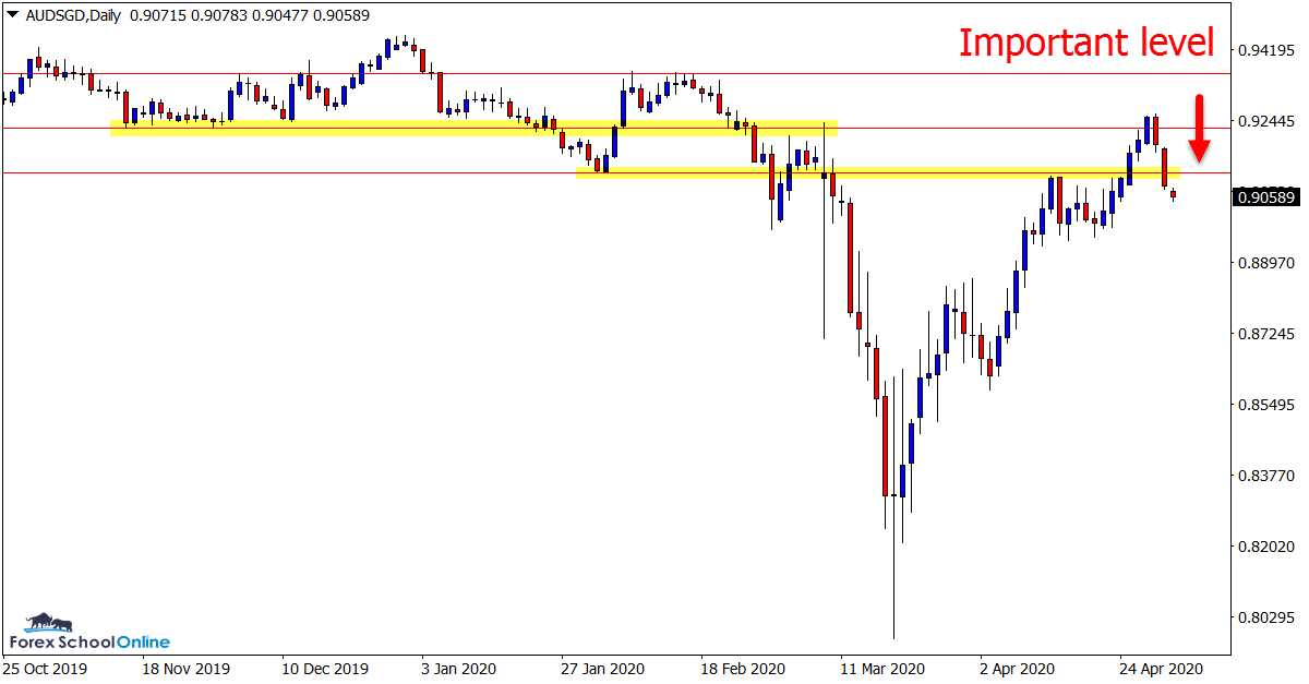 Similar to the EURAUD, the AUDSGD has also formed a weekly pin bar, just inverse.