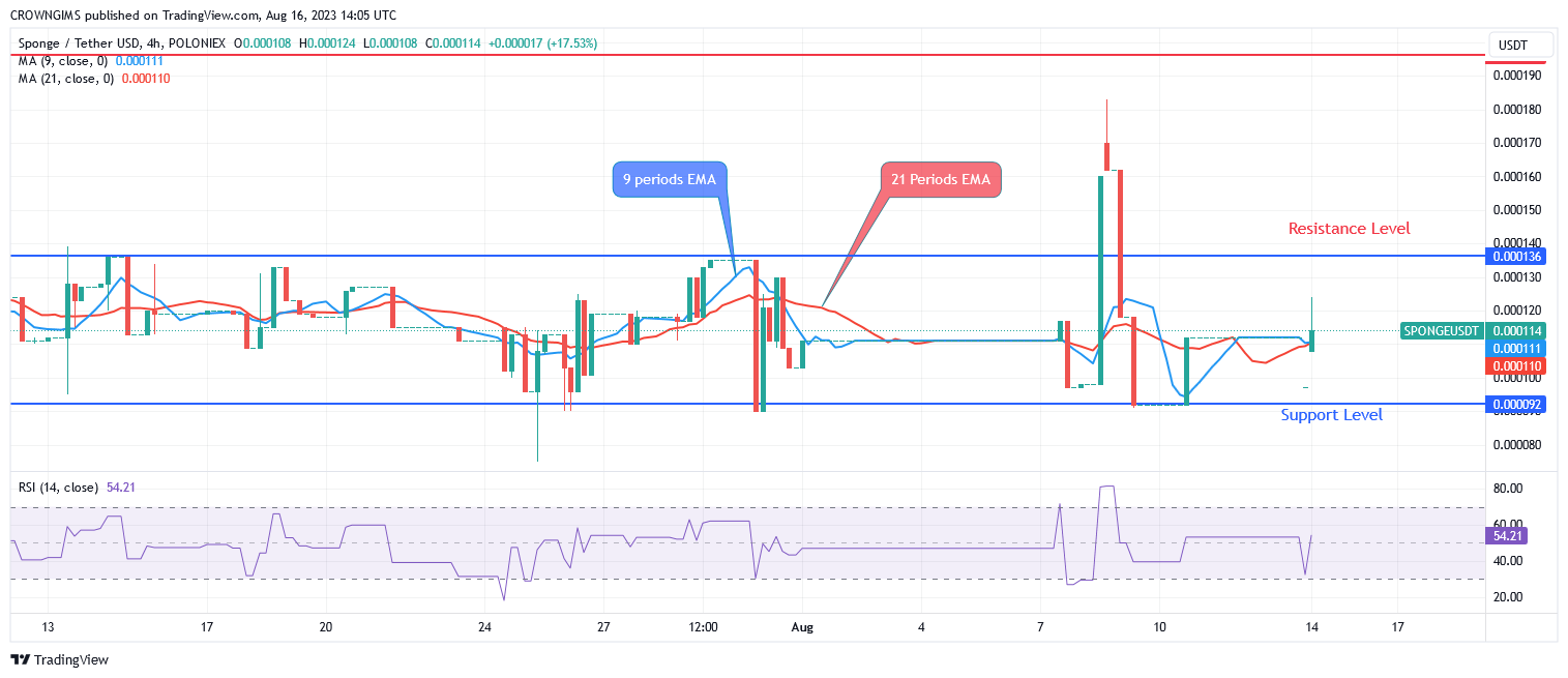 Sponge is bullish on the 4-hour chart. The bears pushed the sponge down to the $0.000093 support level. The bulls fought the price decrease and pushed it up into the $0.000136 resistance level, which was tested on August 8. As the target price of $0.000136 approaches, the price is rising.